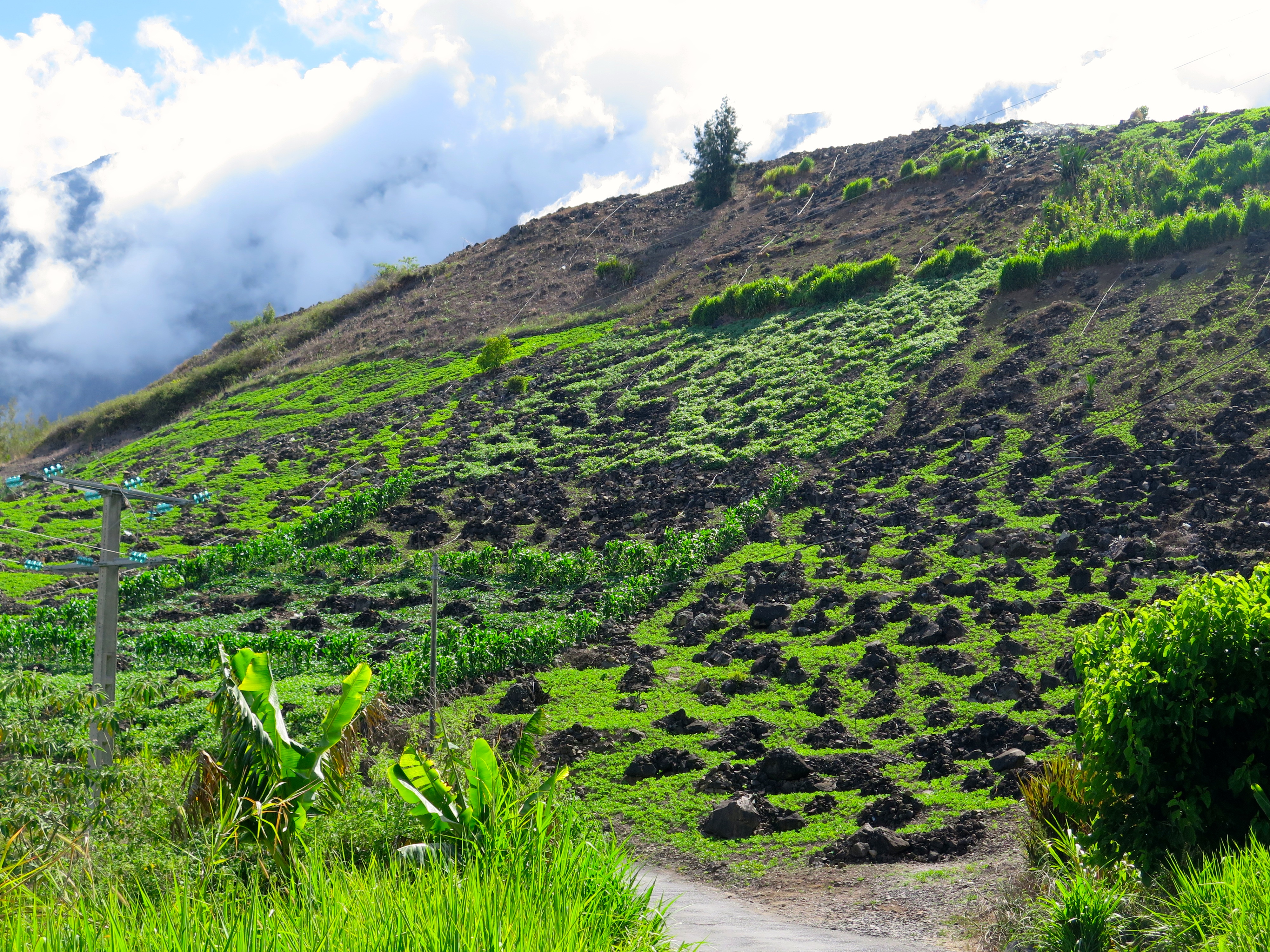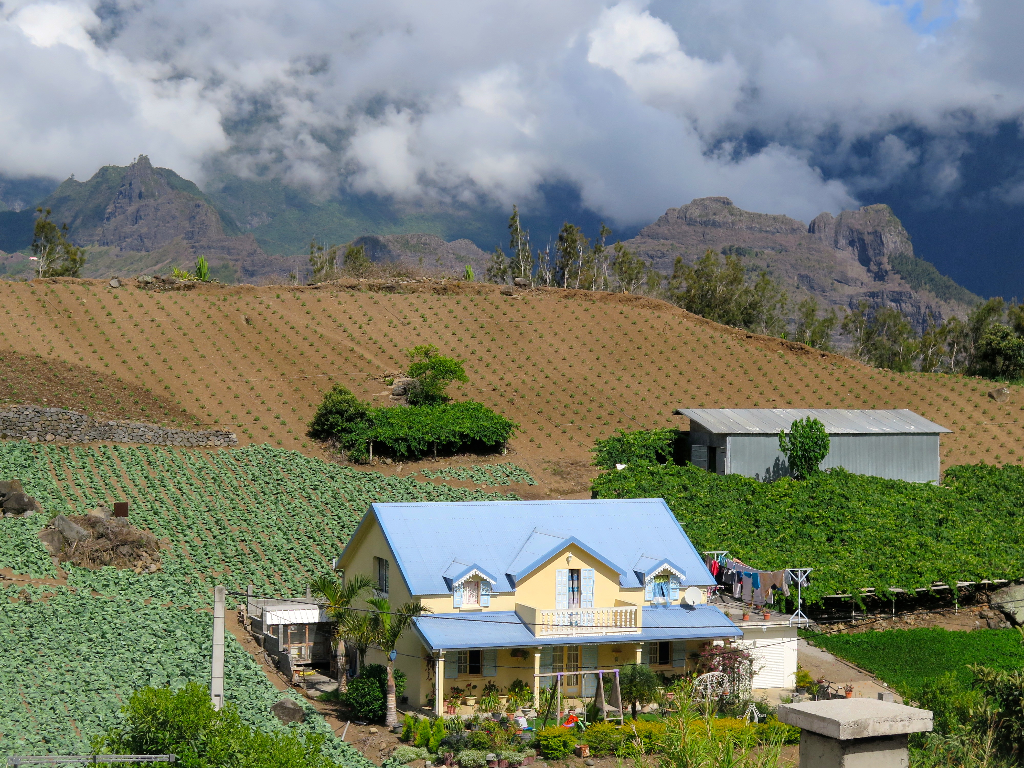 On y cultive toute sorte de légumes comme les haricots, le maïs, la tomate, la courgette mais surtout la fameuse lentille de Cilaos. Véritablement perché sur un promontoire, la culture se fait à la manière d’antan, à la main ou avec des outils rudimentaires. Les roches sont entassées en petits tas et en murettes pour laisser un peu de place aux cultures qui suivent la pente.