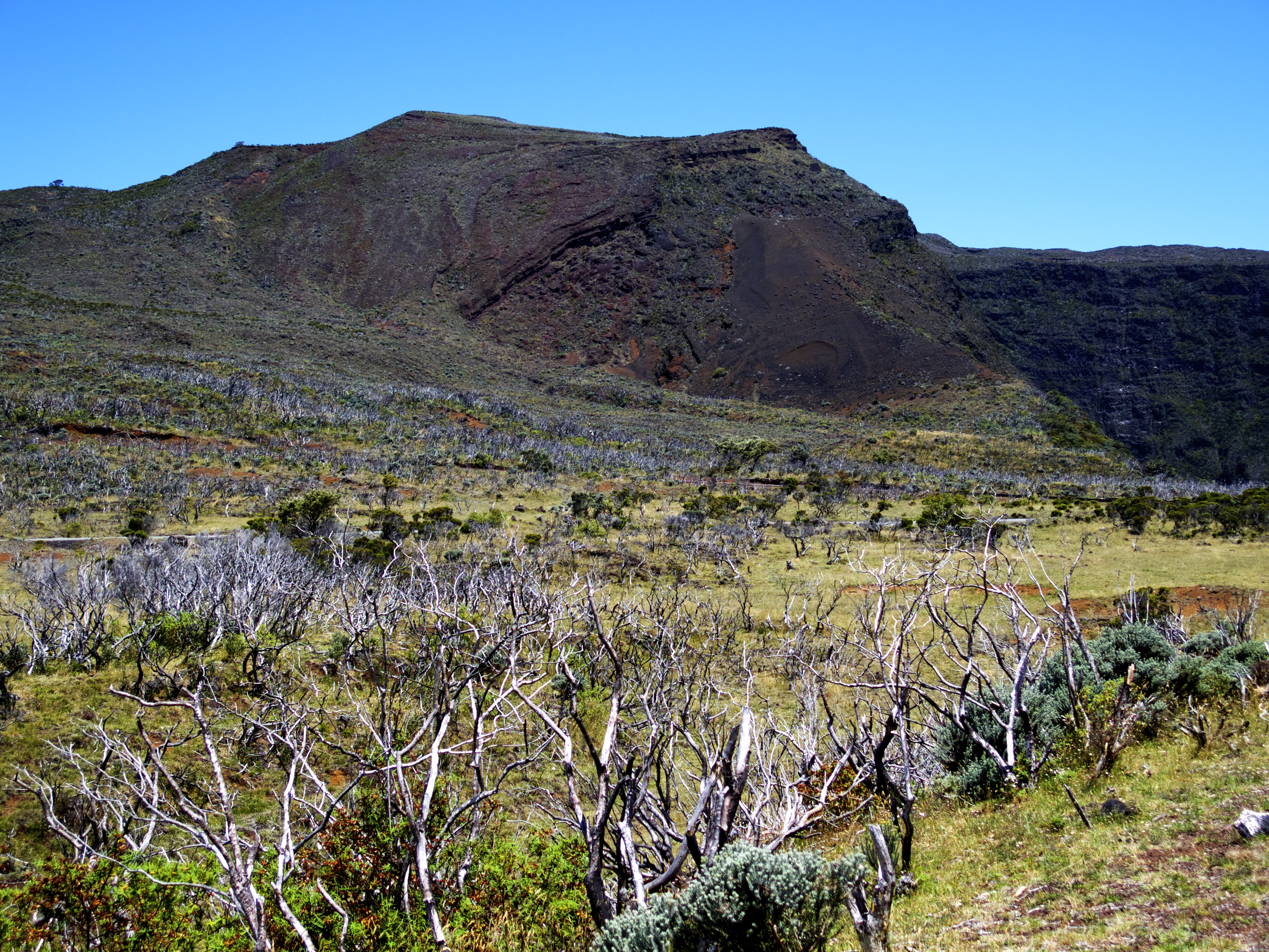 Après un plateau herbeux au milieu duquel trônent encore des arbres calcinés par les incendies, vous arrivez alors au détour d’un virage dans un paysage lunaire, la Plaine des Sables.