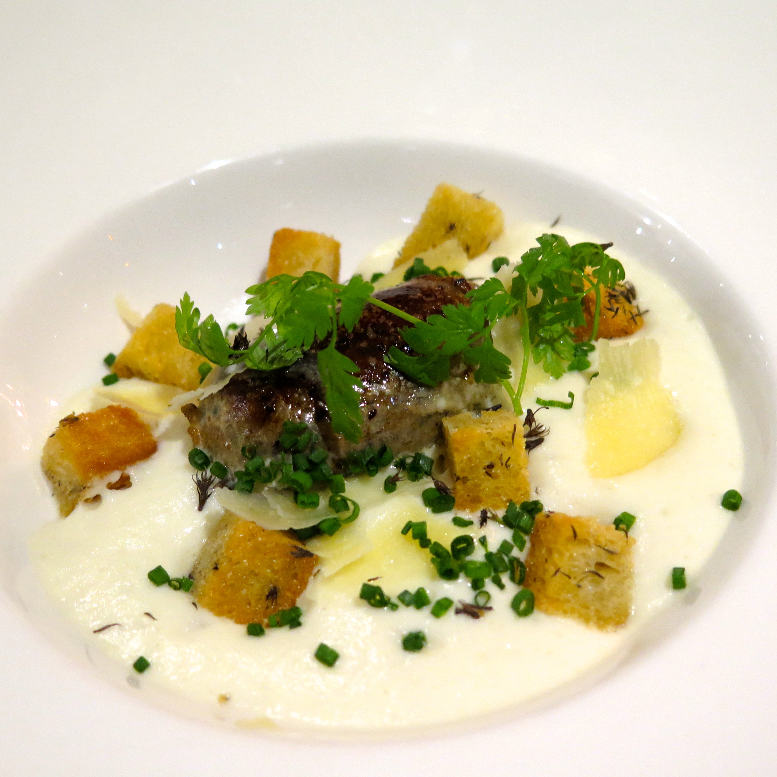 Boudin blanc maison aux trompettes de la mort, mousse de topinambours, coppa & parmesan du pauvre