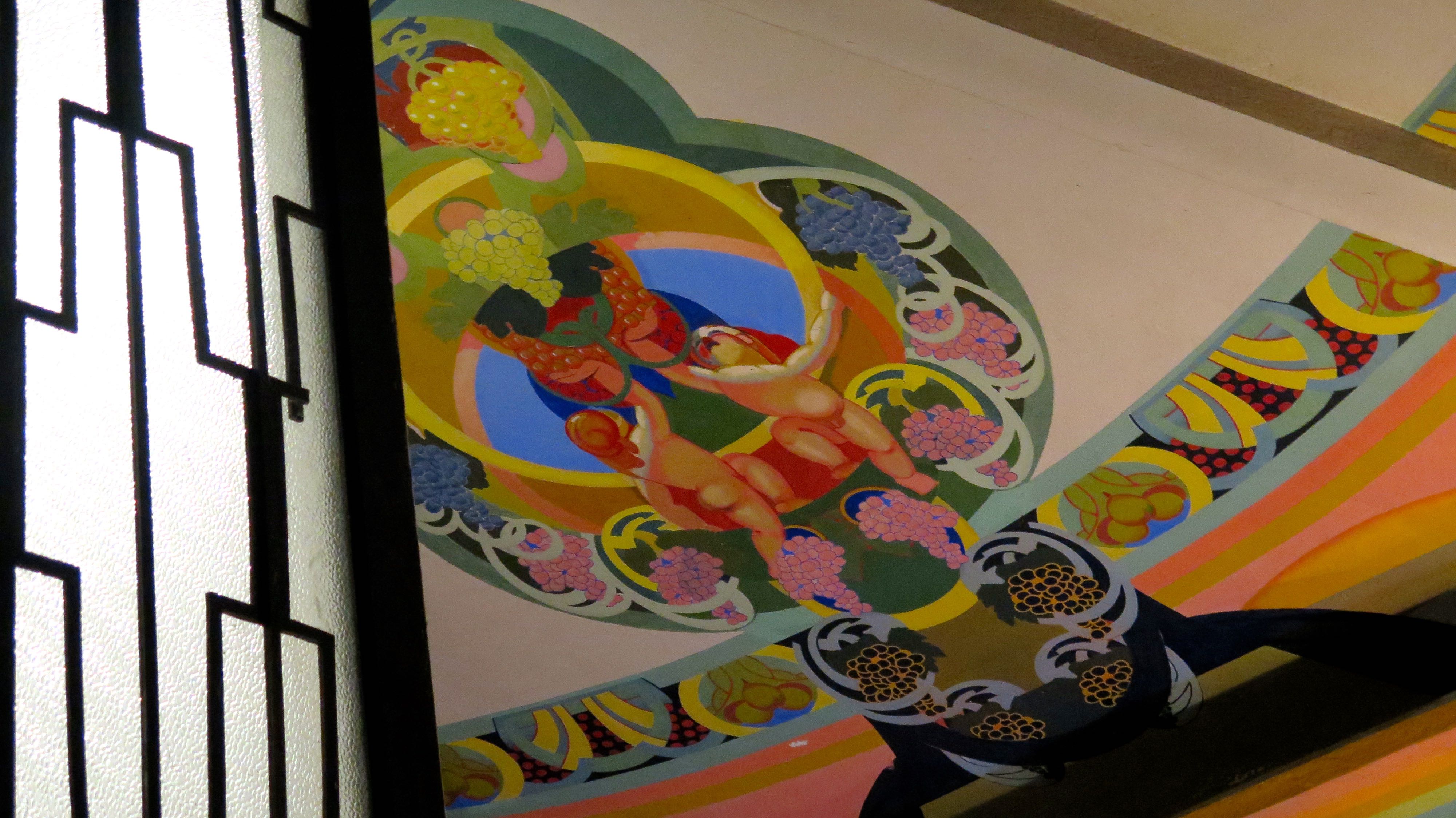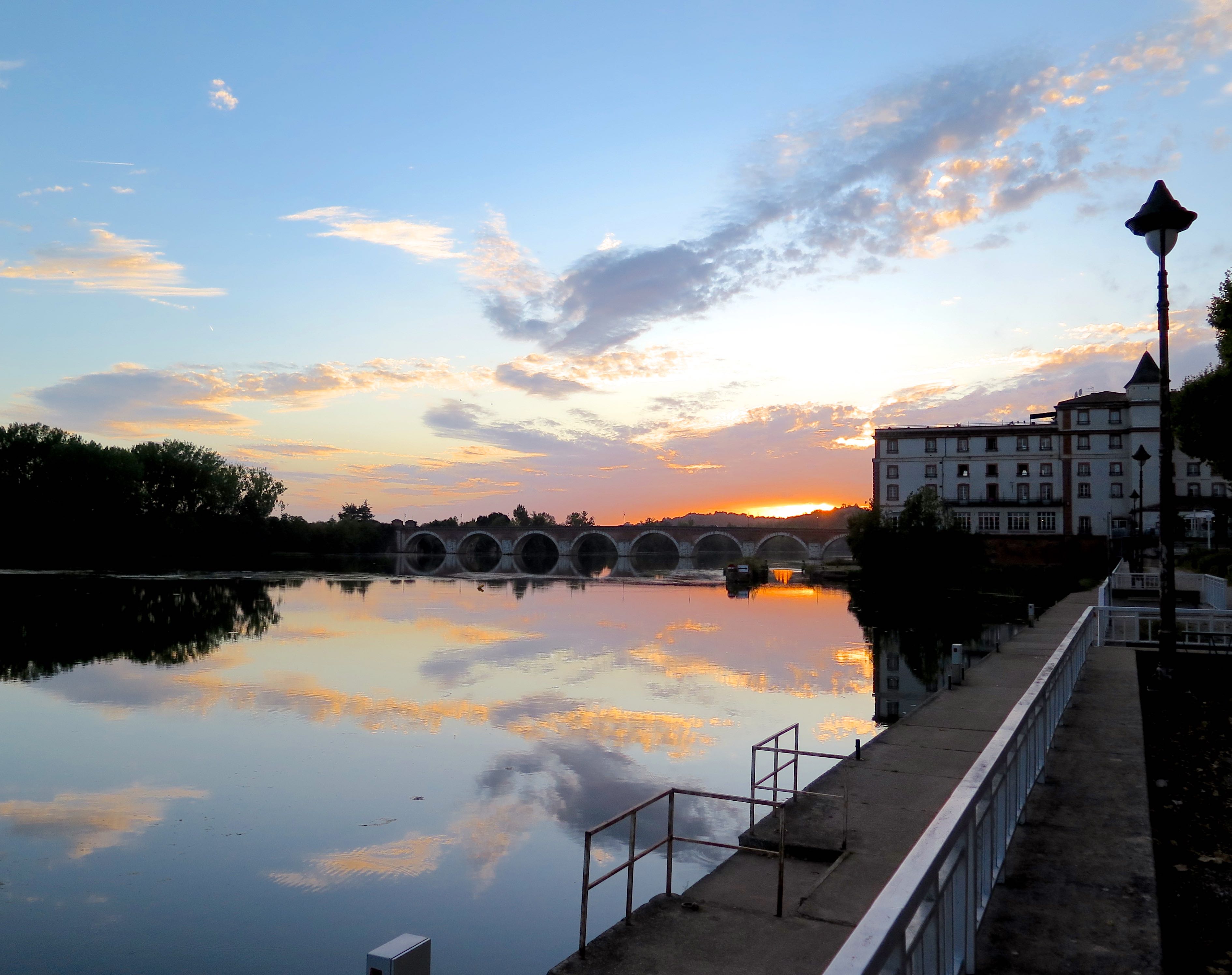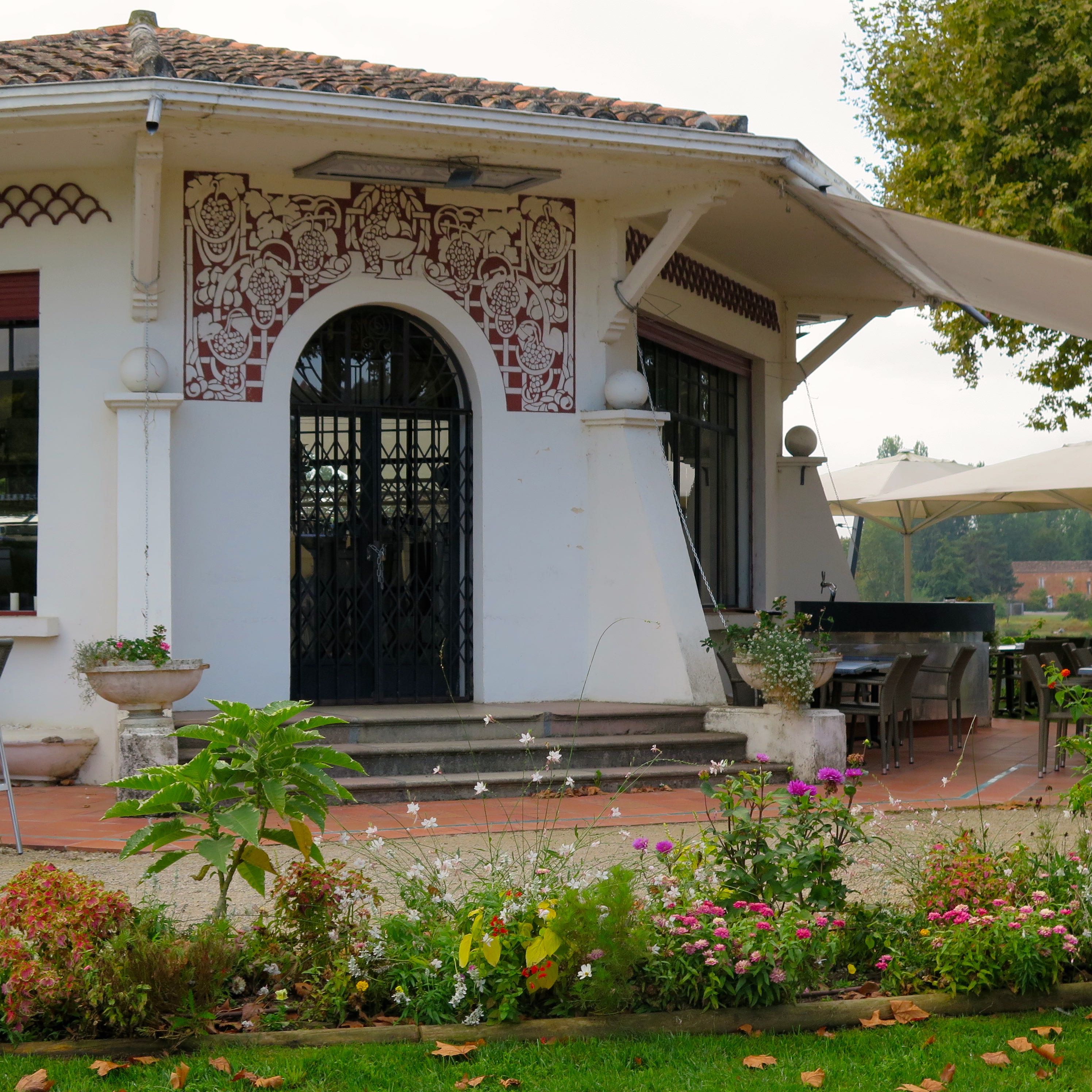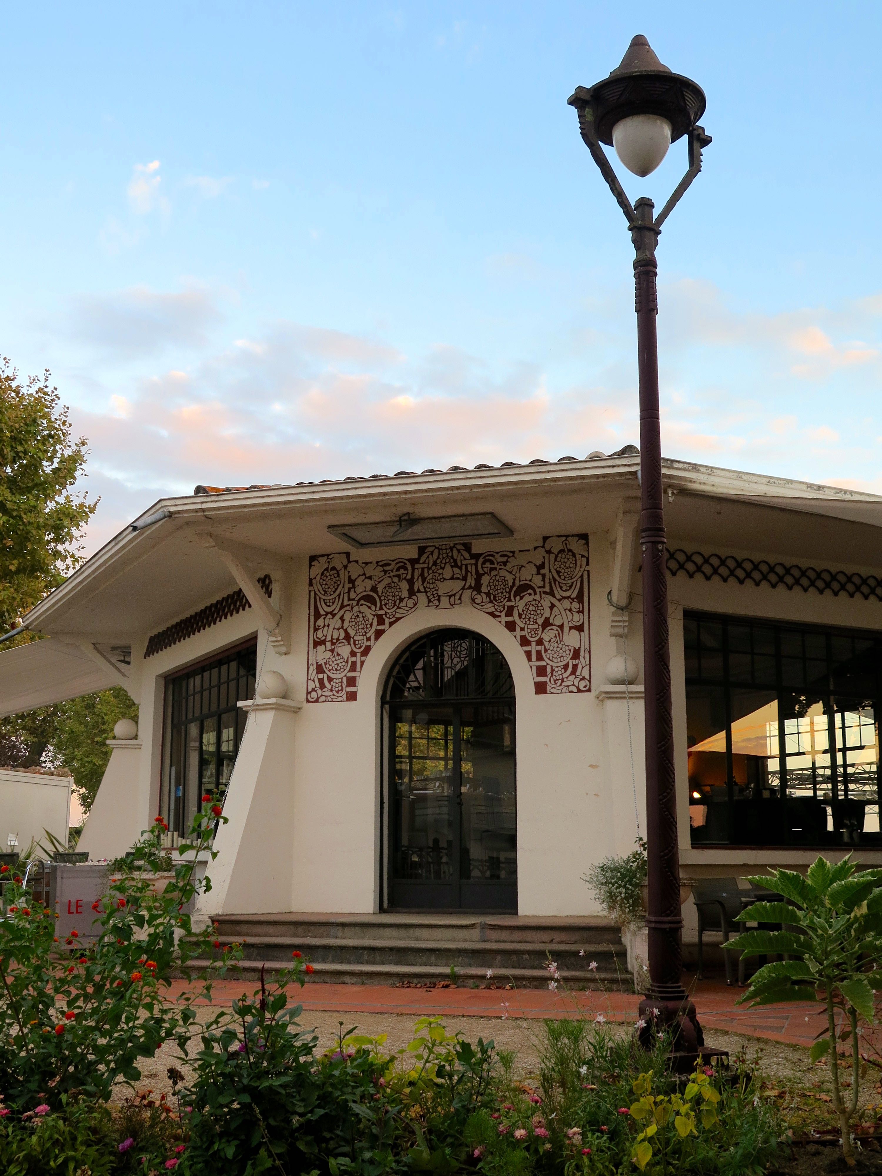 Dès les années 1920, des médecins vantent les bienfaits des raisins et se mettent à prescrire des cures uvales, pour soigner les troubles intestinaux et rénaux. Leur consommation est aussi recommandée pour les sportifs, les tuberculeux et les femmes enceintes. En 1930, la ville est ravagée par des inondations. On décide d’abandonner la brique et de reconstruire dans le style Art déco. On imagine alors de grands projets pour faire de Moissac la première station uvale de France. On envisage un casino, un port de plaisance et un champ de courses pour rivaliser avec les plus grandes stations thermales. Néanmoins, seul un grand hôtel voit finalement le jour en lieu et place de l’ancien moulin, ainsi qu’un uvarium où étaient dispensées les cures et où avaient lieu les festivités. La ville connaitra ainsi de belles années voyant défiler la bourgeoisie et quelques stars internationales. Néanmoins, les rêves des investisseurs imaginant piscine et plage au bord de la rivière ne verront pas le jour. Le paysage n’en reste pas moins charmant. D’ailleurs ce soir, je profite d’un magnifique coucher de soleil sur l’esplanade en bord de Tarn, avant d’aller dîner à l’Uvarium. La rotonde a été transformé en restaurant plutôt moderne, mais où l’on peut encore, admirer les fresques Art déco de ce glorieux passé.